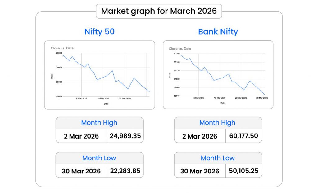 In March 2026, the Nifty 50 declined 11.31% (2,847 points), while the Bank Nifty plunged 16.94% (10,253 points). The Nifty slipped below the key 23,000 level amid intense selling pressure and closed just 588 points (~2.5%) above its CY2025 low (21,743), and 1,194 points (~5.5%) above its CY2024 low (21,137). Despite positive US–India trade developments, markets remained under pressure due to the ongoing US–Israel–Iran conflict, with the prolonged war dragging the Nifty down ~14% YTD. Volatility surged during the month, with India VIX jumping 103% to 27.9. Brent crude rose 41% to $103, while the Indian Rupee depreciated 2.65%, hitting a record low of ₹95/$ amid inflation and fiscal deficit concerns. In the cash segment, FIIs recorded a historic net selling of ₹1.2 lakh crore — the highest ever in Indian market history — while DIIs bought ₹1.4 lakh crore. All sectoral indices ended in the red, with PSU Banks being the worst hit (down 19.83%), while Pharma was the least declining sector.