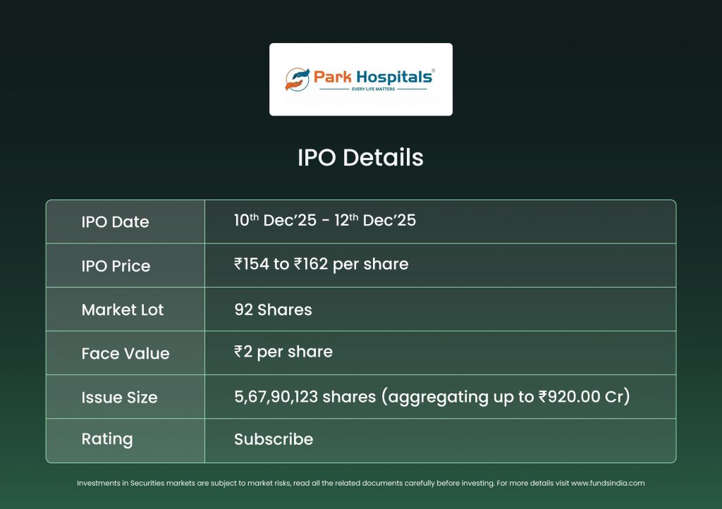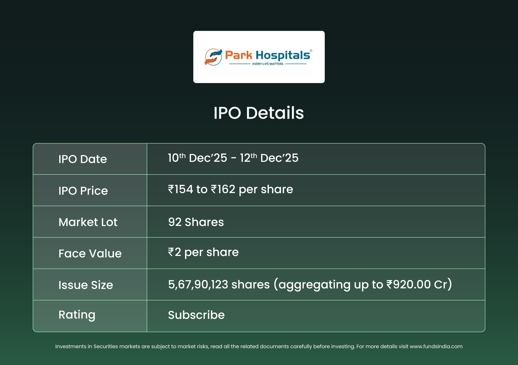 Park Medi World has demonstrated sustained revenue growth, strong operating margins, and efficient capital deployment within the North India hospital market. Its focus on high-acuity specialties, cluster-based expansion model, and affordability-led positioning provide a solid platform for continued scale and utilization improvement. A meaningful allocation of IPO proceeds toward debt reduction and network expansion is expected to strengthen balance sheet flexibility and support incremental bed additions. According to the RHP, Fortis Healthcare Ltd, Apollo Hospitals Enterprise Ltd, Max Healthcare Institute Ltd are a few of its listed peers. The peers are trading at an average P/E of 69.11x with the highest P/E of 101.54x and the lowest being 48.6x. At the higher price band, the listing market cap of Park Medi World will be ~Rs. 6,997 crore and the company is demanding a P/E multiple of 33x based on post issue diluted FY25 EPS of Rs.4.93. When compared with its peers, the issue seems to be fully priced in (fairly valued). Based on the above views, we provide a ‘Subscribe’ rating for this IPO for a medium to long-term Holding.
