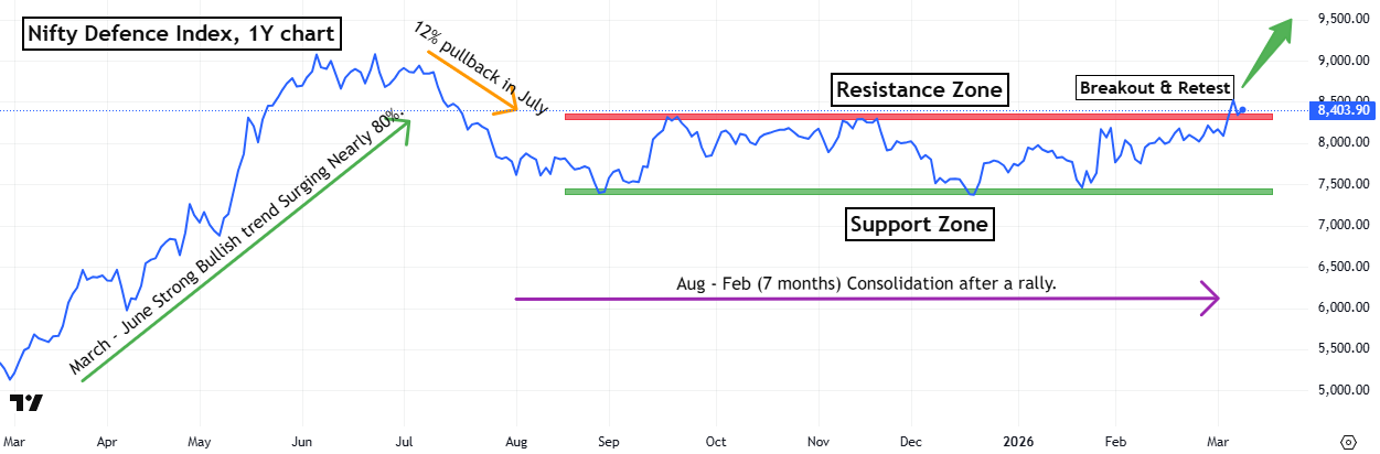Nifty Defence Index displayed resilience on the weekly chart during the first week of March 2026 when most sectoral indices ended in the red, yet the index advanced 4.89%. The move came during an extreme volatile week with IndiaVIX surging 45% and Brent Crude jumping 27% amid escalating tensions between the U.S.–Israel and Iran. Technically, the 8,300 level acted as a major resistance since July 2024, and the index declined nearly 40% from its July high. The index tested the 8,300 resistance again but initially failed to close above it. However, it has now broken out above the 8,300 level, ending the seven-month consolidation range of 7,400–8,300. This week, the index retested its breakout level and confirmed the continuation of the uptrend. Importantly, the price respected the 50-day EMA and took support last week, reinforcing the ongoing uptrend. The 7,400 region continues to act as a strong demand zone since August 2025, where repeated pullbacks found buyers, sustaining the broader uptrend. Weekly RSI (14) is trending higher at 60, indicating strengthening bullish momentum, while the index is trading comfortably above both the 50-day EMA (8,022) and 200-day EMA (7,780), reinforcing the continuation of the broader uptrend.