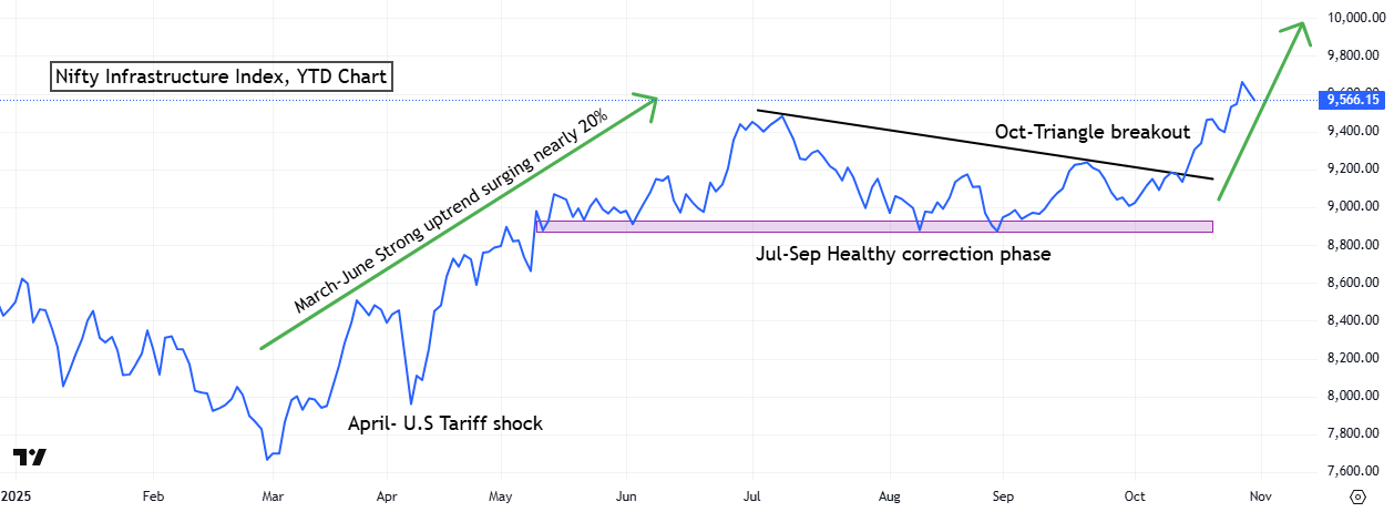 The Nifty Infrastructure Index has maintained a resilient uptrend through 2025 despite periods of volatility. The year began with weakness in January–February, but a strong recovery emerged in March, even after a brief April dip triggered by the U.S. tariff shock that temporarily impacted sentiment.