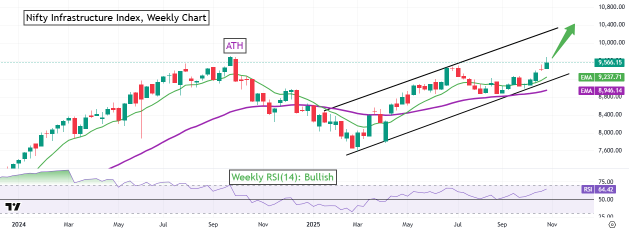 The Nifty Infrastructure Index remains in a strong bullish trend, supported by rising 50-day and 200-day EMAs and a healthy weekly RSI of 64.42, suggesting scope for further upside. Trading well above its key averages, the index may see brief consolidation, but the broader uptrend stays intact after a 7.7% rally in the past two months. Sustaining above 9,500 could pave the way toward the 10,200 mark. On the flip side the trend will turn bearish below 9,250. Key supports: 9,400 / 9,250 / 9,000.