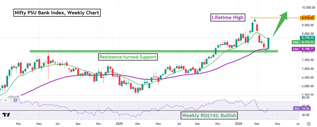 The Nifty PSU Bank Index staged a strong rebound in the first week of April 2026 amid improving global sentiment. Volatility eased sharply, with IndiaVIX falling 26% to 18.85, while Brent crude declined 13% to $94 following a ceasefire announcement by Donald Trump during the U.S.–Israel–Iran tensions. Despite no formal agreement, markets witnessed broad-based buying, with all sectoral indices ending in the green for the week. The PSU Bank Index outperformed, surging 7.92% versus Nifty’s 5.89%, and formed a strong bullish weekly candle closing near its highs. Technically, the index took support at the 200-day EMA (8,148) and closed above the previous three-week high, indicating strengthening momentum. The 8,100 zone, which acted as resistance in 2024 (CY 2024 high – 8,053), has now turned into a strong support zone, aligning with the 200-day EMA. Notably, this is the first weekly gain above 7% since October 2024 and the strongest so far this year. The index also reclaimed the 50-day EMA (8,730) within the week. Weekly RSI (14) has moved above 50 to 54.56, signalling improving bullish momentum. Sustained strength could lead to a retest of the lifetime high (9,918) and a potential move above 10,000.