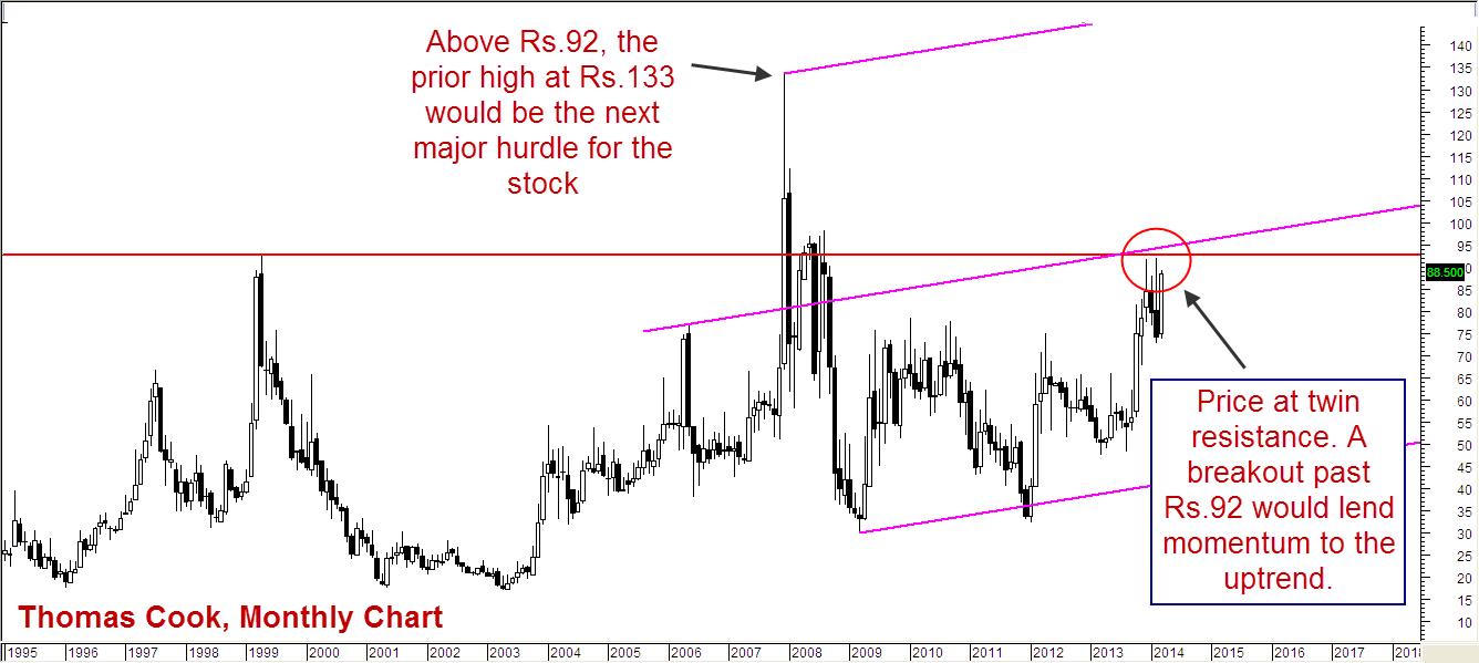 We expect Thomas Cook to soon challenge its life-time high of Rs.133. As highlighted in the above chart, the stock is consolidating near the key resistance level (represented by the horizontal red line and the middle line of the magenta pitchfork). A breakout past Rs.92 would impart momentum to the uptrend and strengthen the case for a rise to Rs.133 and beyond.