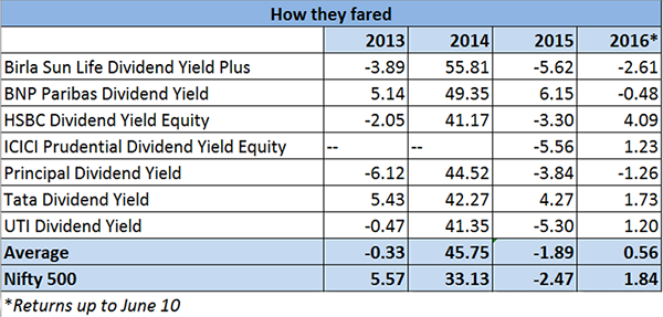A dividend yield fund simply follows a different investment strategy to keep volatility low and downsides contained. Their name is derived from the strategy they follow; these funds do not have an onus to pay dividends. Due to the value-based strategy dividend yield funds follow, and the contrarian calls they make, such funds necessarily require a long-term time-frame. To hold such funds, you need to be willing to take these contrarian calls, and should have some risk appetite. Given that corporate performance, economic recovery, and therefore the markets have not panned out as expected, value picks have not worked. From here, a more broad-based market recovery based on improved fundamentals can help turn around the story for dividend yield funds.
