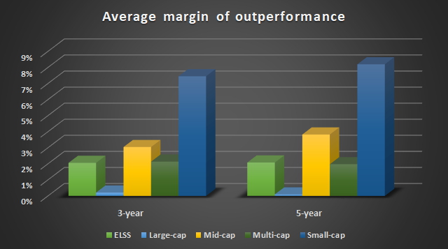 The average margin of outperformance is very small for large-cap funds, slightly more for multi-cap and ELSS funds and bigger for mid-cap and small-cap funds. Again, the margin of outperformance was higher over a 5-year period.