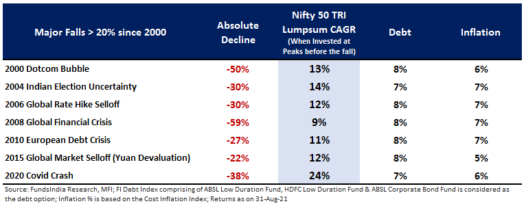 Roughly 70% of the time, a simple ‘invest-immediately-when-you-have-the-money’ strategy combined with loads of patience to ignore frequent market tantrums provided you decent return outcomes (greater than 10% CAGR) over 5 years. Further, simply extending time frames by 1-2 years improved the odds to around ~80%.