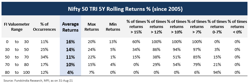 We went back 16+ years and checked for future 5-year equity returns for Nifty 50 TRI at different starting valuations (proxied by our internal valuation indicator – FundsIndia Valuemeter – based on 4 valuation parameters – MCAP/GDP, PE Ratio, PB Ratio and Earnings Yield/GSec Yield).