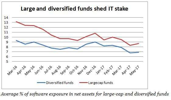 Up until February 2017, about half the 50-odd large-cap funds held exposure to the software sector at levels above that of the Nifty 100 index. The index weight has been around 10-13% in the past year. By the time April and May 2017 rolled around, only 2 in every 10 funds held software stakes at levels above the index. On an average, funds held 8.7% in the sector in May 2017, against the 12.4% the preceding May. Even contrarian and value-oriented funds dropped holding as the March quarter results showed continued pressure on numbers, and post the various bonus and buyback bonanzas.