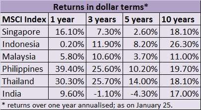 Southeast Asian markets (ASEAN) seem to be the new destination for investors hungry for returns; so tells the performance of these markets in the last few years. The MSCI South East Asia Index delivered annualized returns of 13.1 per cent and 5.3 per cent in the last three and five years respectively. In comparison the BSE Sensex managed more mediocre numbers of 6.2 per cent and 1.8 per cent (would be slightly lower in dollar terms). In 2012 too, this index beat Indian markets.