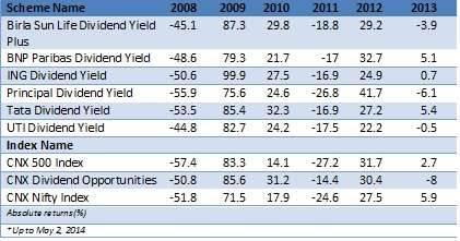 The graph here shows the calendar year return of these funds that suggest that in years of downturn and years of recovery, dividend yield funds have beaten the bellwether index as well as broad markets. 2013 was an exception, for reasons earlier stated.