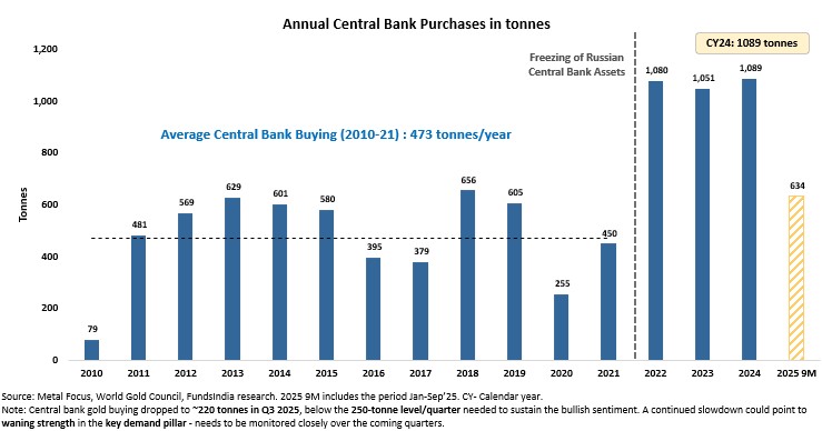 That said, central bank purchases have begun to moderate, with quarterly buying slipping below the ~250-tonne pace needed to sustain 1,000 tonnes annually. This is a key trend to watch, as any further slowdown could weigh down the gold prices.