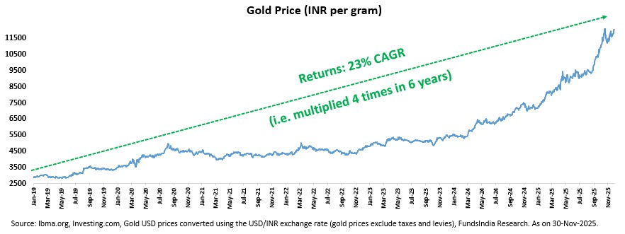 Gold has witnessed a sharp rally over the last 6 years (2019-2025), gaining ~23% annually and multiplying 4x!
