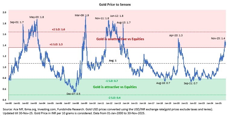 The current Gold to Sensex ratio is at 1.4x, indicating Gold is expensive relative to Equities.