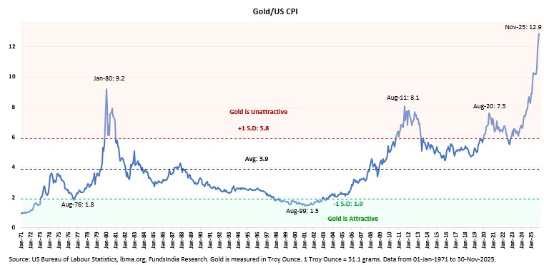 Currently, the ratio is at 2.7x (Nov-25), above the historical averages of ~1.7x , indicating Gold is overvalued.