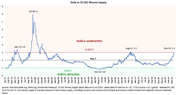 Currently, the ratio is High at ~3.1x (vs previous peaks at 3.2x in 2011 & 8x in 1980) -> Indicating gold is unattractive vs Liquidity trends.