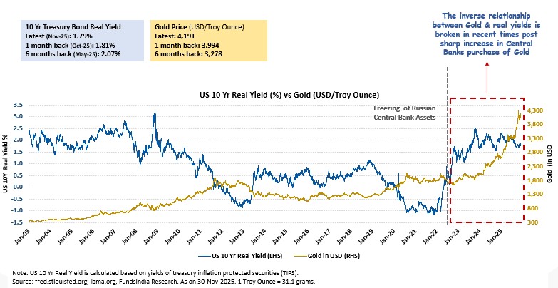 Gold therefore remains strong despite high real yields (1.79% as on Nov-25).