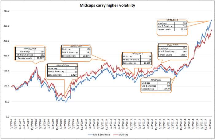 The graph shows that mid- and small-cap funds swing more than multi-caps. Multi-cap funds, on the other hand, contain declines better and do not lose much on the upside in rallies. It is important to understand this volatility prevalent in mid-cap funds before you invest.