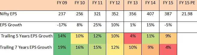 Nifty earnings growth for FY 14 and FY-15 have been way below its 10 and 15 year averages. As a result, investors continue to repose faith in companies reporting growth rates higher than the market, even though the trajectory of their growth appears to have flattened. Valuations, as we have seen before, by themselves will not lead to a correction.