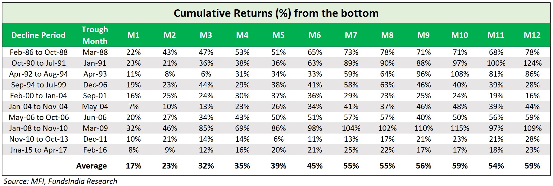 The important thing to remember is as the market keeps factoring in bad news, at some point in time the markets will no more be shocked by further bad news. At such low expectations, we don’t need things to move from ‘really bad’ to ‘good’. A simple change in perception from “really bad” to “less bad” is all it takes for a reversal.