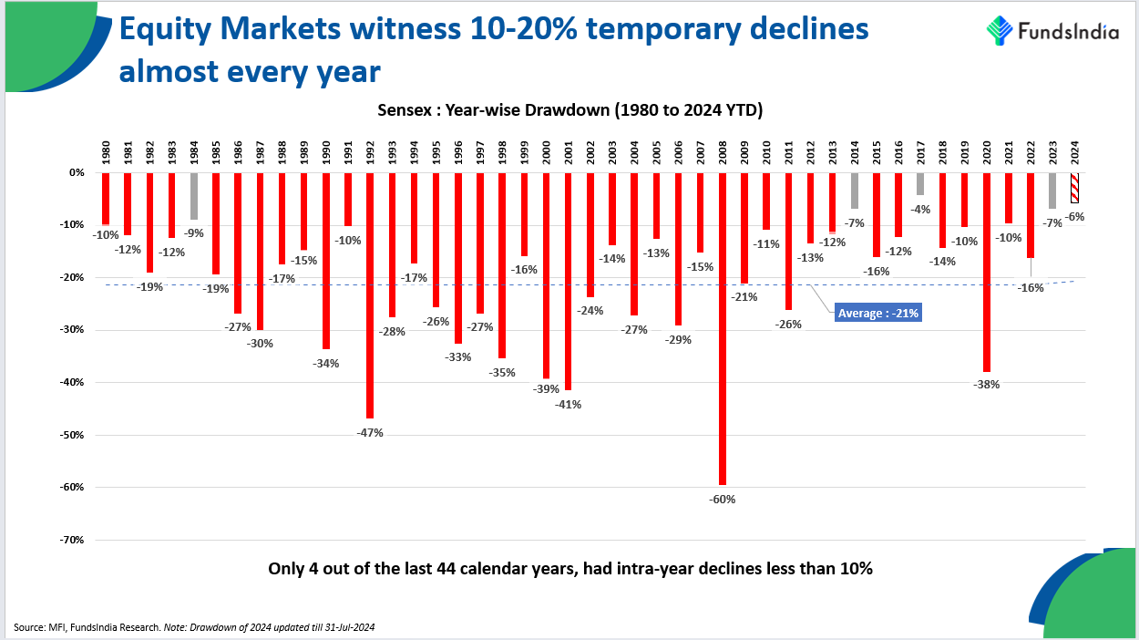For a better understanding of market declines, let’s look at history. In the below chart, you can see the calendar year-wise drawdowns for Sensex over the last 44+ years.
