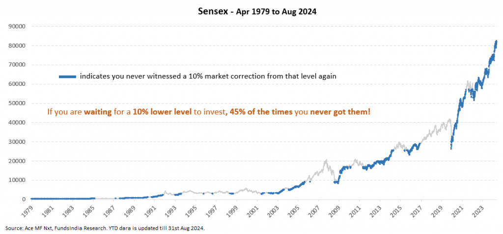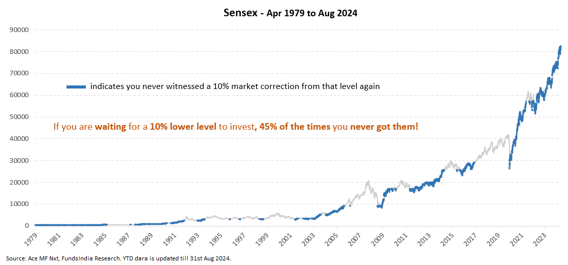 In the chart below, we’ve analyzed Sensex data from 1979 to the present (Aug-2024), covering more than 45 years. For each day in this period, we examine the chances of the market dropping 10% from that day’s level if you decide to wait.