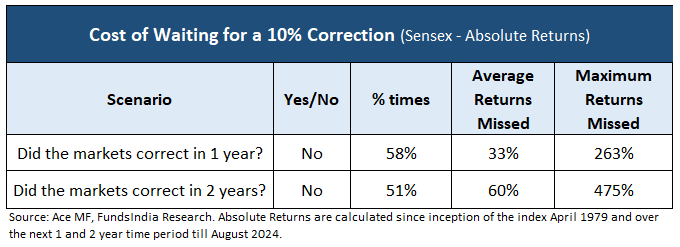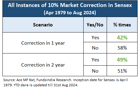 For instance, on March 24, 2020, the Sensex was at 26,674. A 10% correction would bring it down to 24,000. We then check if, between March 25, 2020, and August 31, 2024, the Sensex ever fell below 24,000.