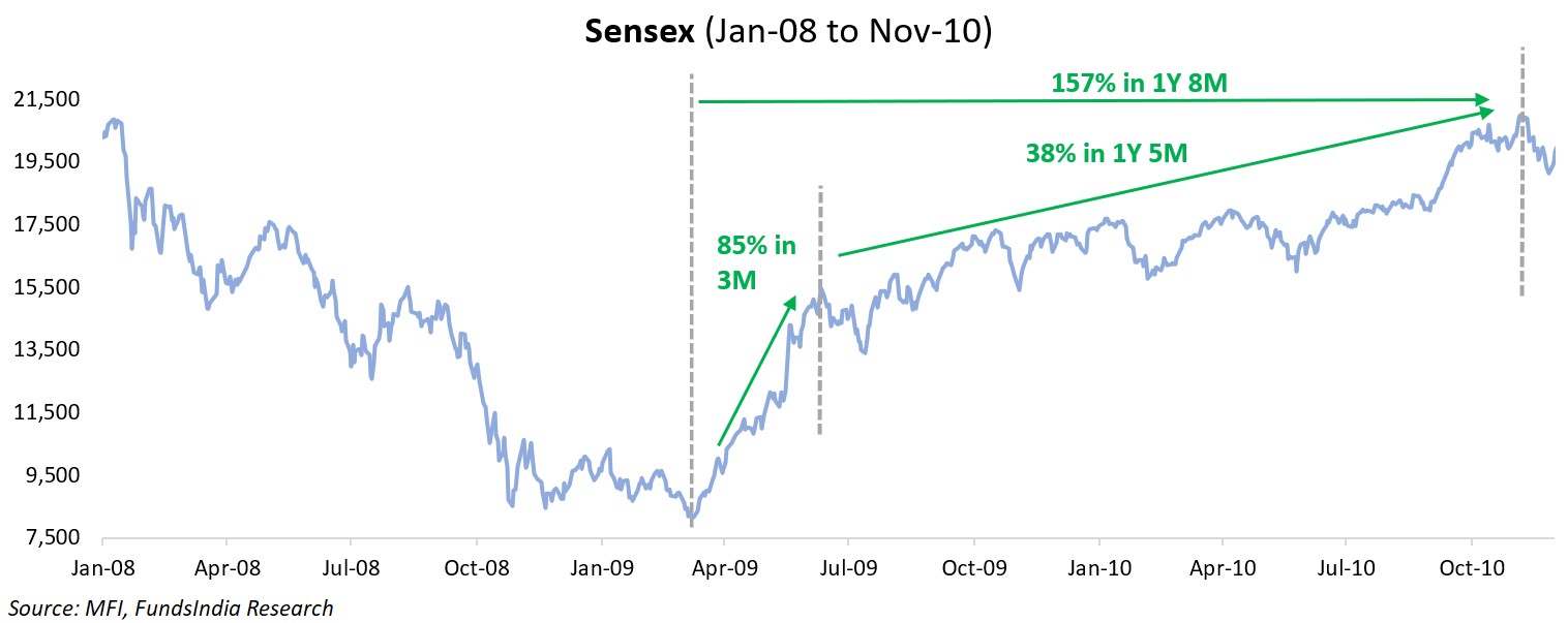 The initial recovery is extremely fast – usually, the first 1 to 3 months capture most of the recovery gains. Sample this – During the market recovery of the 2008-09 Sub Prime Crisis, the markets went up a whopping 85% in the first three months.