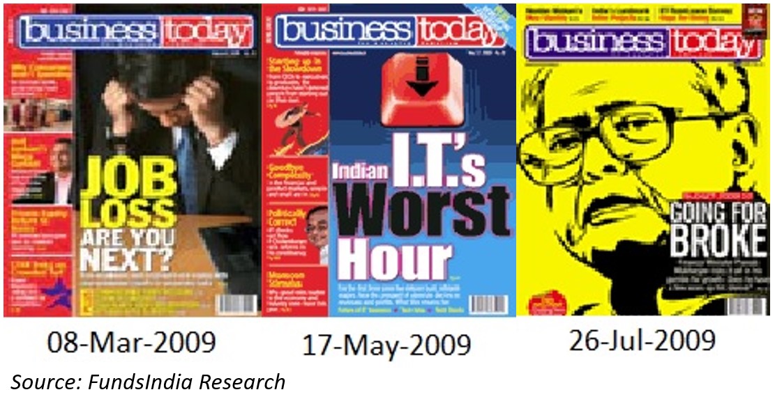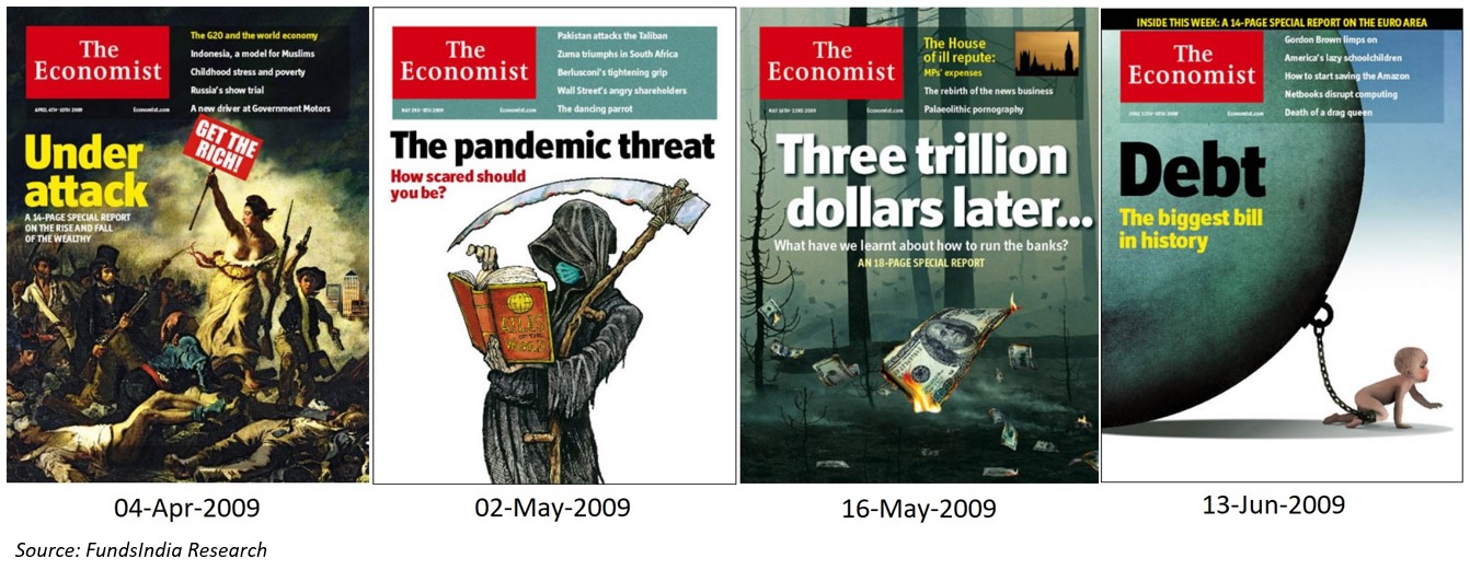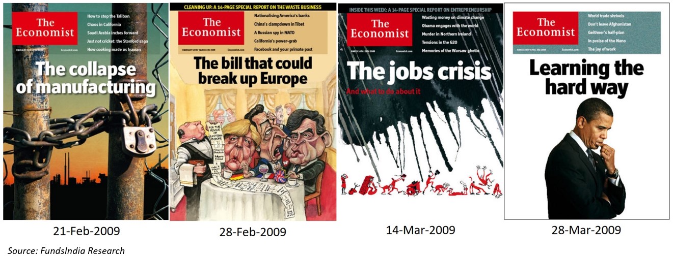 The magazine covers in 2009 give us a sense of how scary the news was, while the market silently started to recover in the middle of all this.