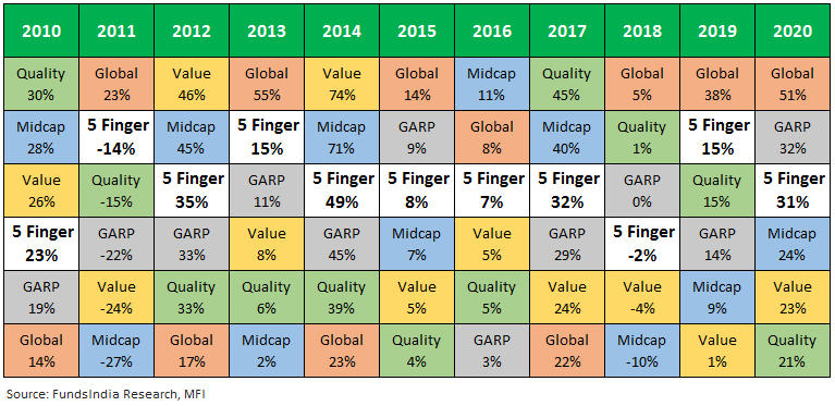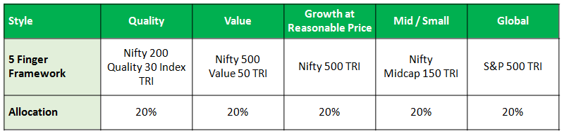 - An alternate approach to equity fund portfolio construction – 5 Finger Framework – Allocate 20% to each of the five investment styles – Quality, Value, Growth at Reasonable Price, Mid & Small Cap and Global Exposure
