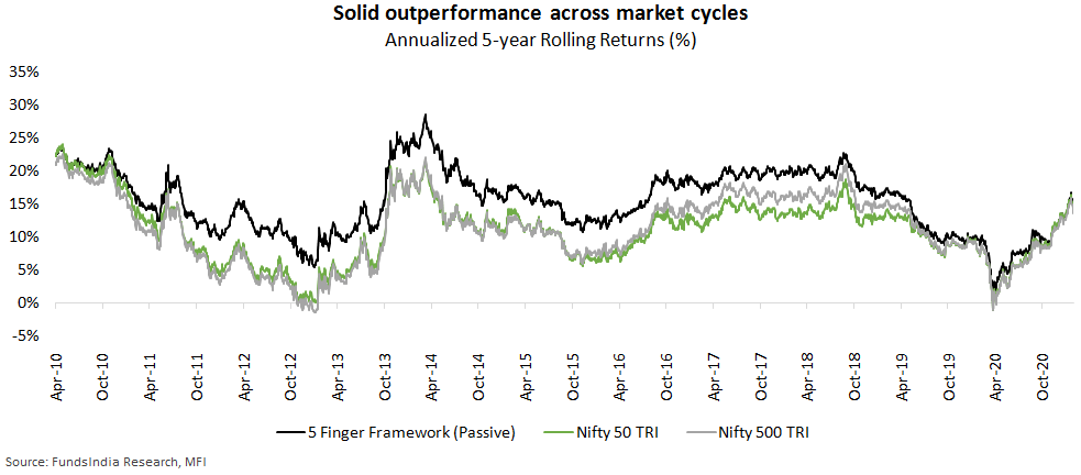 The passive 5 Finger framework has beaten the benchmark indices three-fourth of the times by more than 2%.