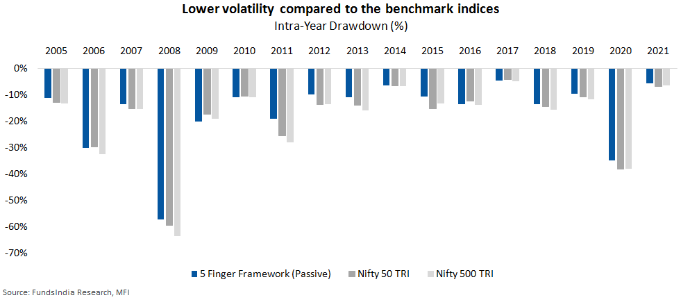 As seen from the intra-year declines (maximum falls faced by the broader market within a year), the portfolio using the 5 Finger framework has fallen lower than the benchmarks.