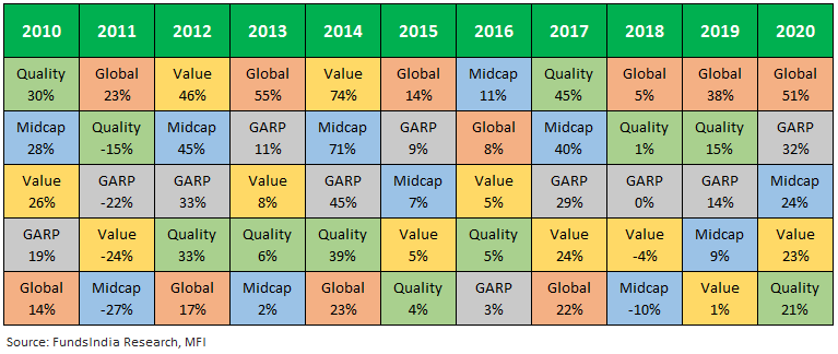 The above four styles pertain to the Indian context. So, in order to ensure a bit of geographical diversification in the portfolio, we can add Global Exposure also to our list.