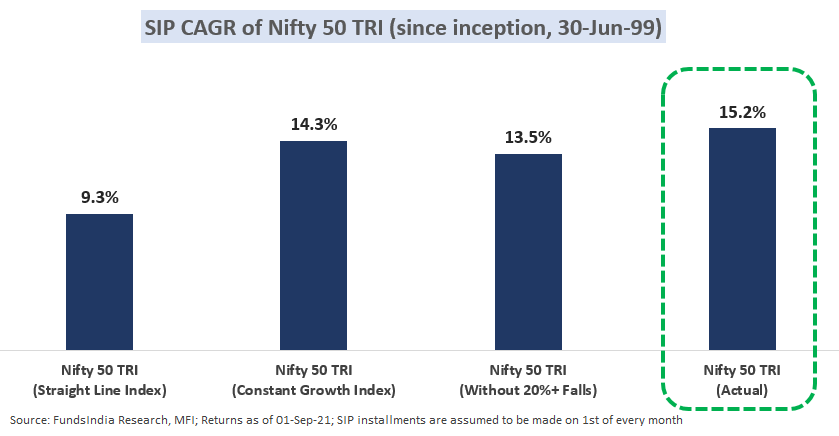 The SIP returns of a Nifty 50 TR index where none of the major declines (declines over 20%) happened were 13.5%!