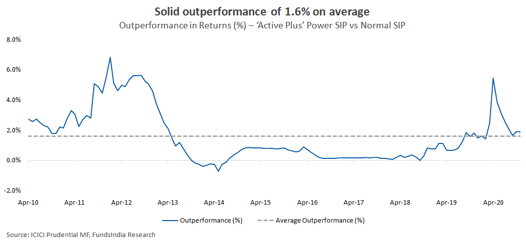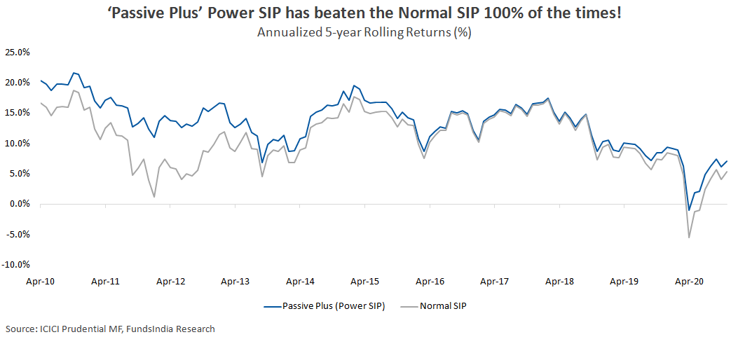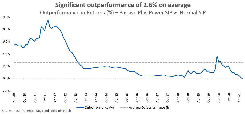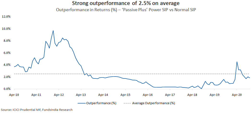 ‘Passive Plus’ Power SIP strategy has given a strong outperformance of 2.6% on average versus the normal SIP.