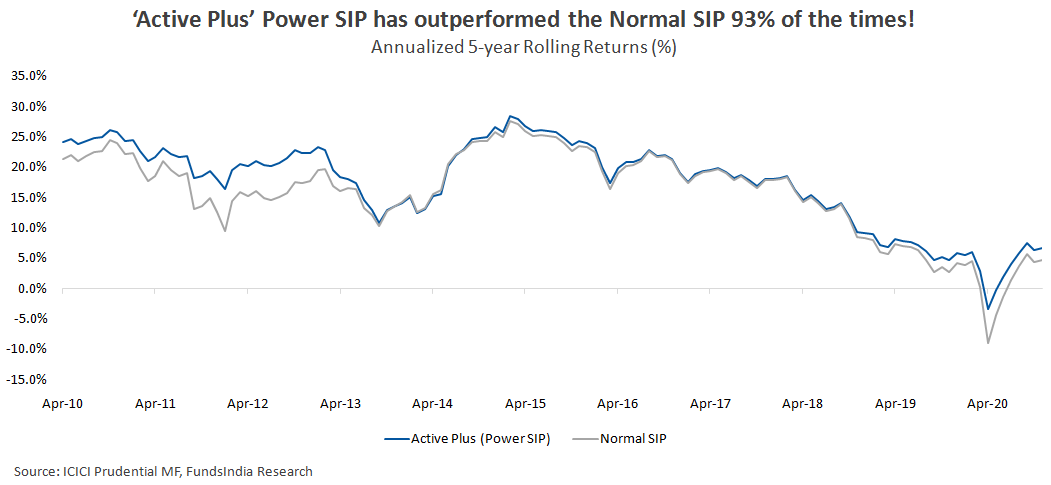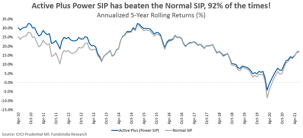 ‘Active Plus’ Power SIP has beaten the returns of the normal SIP investment made into ICICI Prudential Value Discovery Fund 92% of the times on a 5-year rolling basis in the last 15 years.