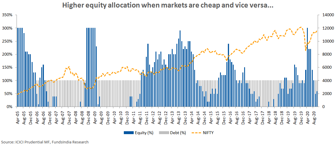 3. Markets are cheap (100-300% of monthly investment into equities): Assume the valuation model indicates 300% allocation to equities. In this case Rs. 30,000 will be invested into equities. Rs. 10,000 will come from your actual monthly investment. The remaining 20,000 will be shifted from money that was previously parked into the debt schemes when the markets were expensive.