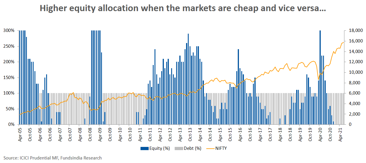 The monthly equity investments can be up to 300% of the SIP value during cheap markets with the excess amount getting shifted from debt schemes to the equity schemes. Similarly, when markets become expensive, the allocation to equities can go as low as 30%* (i.e. the 70% of the SIP amount for that month will be temporarily parked in debt).