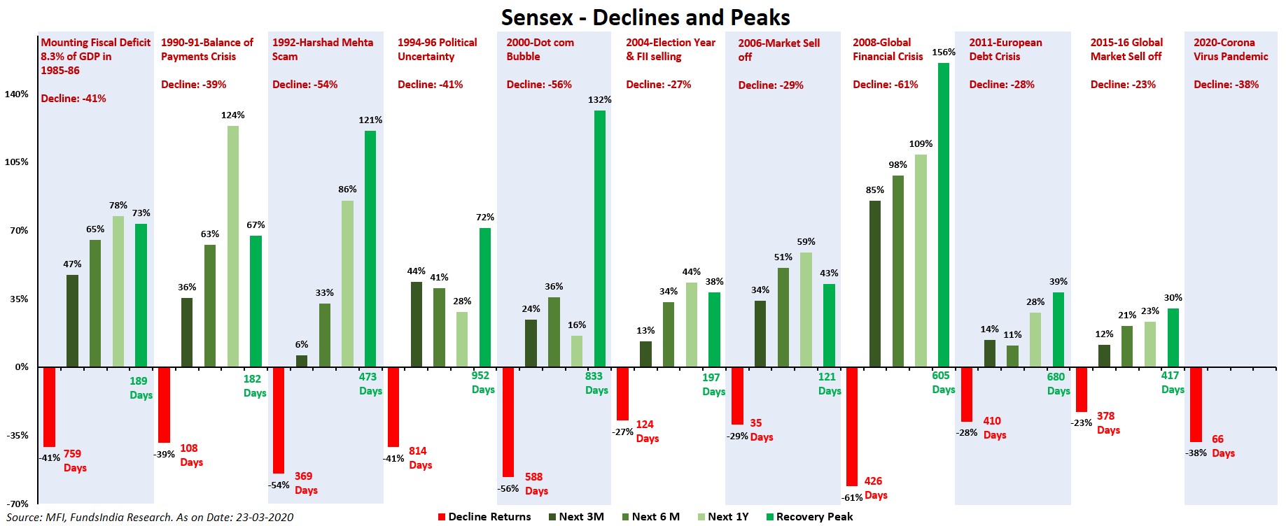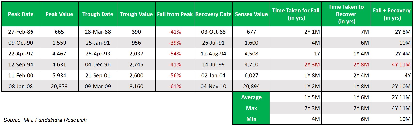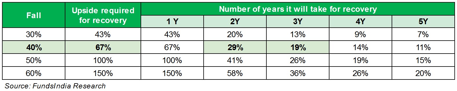 In the past, from the point of 40% decline, the markets on an average have taken 2 years to recover to the previous peak level. While the shortest period of such recovery has been 6 months, the longest period has been 3 years and 3 months.