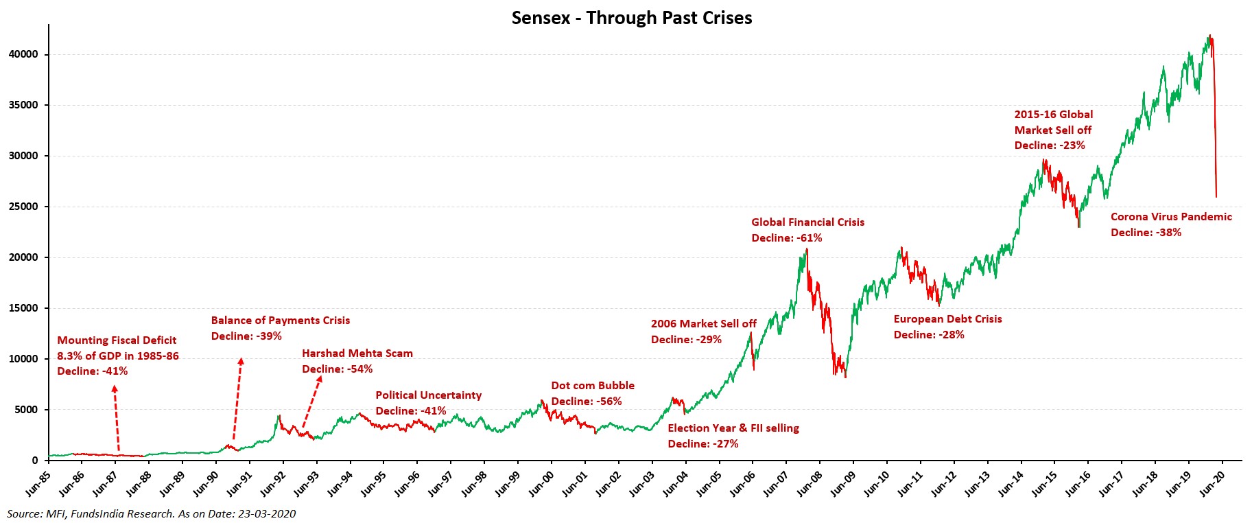 - % of times Sensex has traded below 50% decline from the peak: 2% (200 out of 9428 trading days since 1980)
