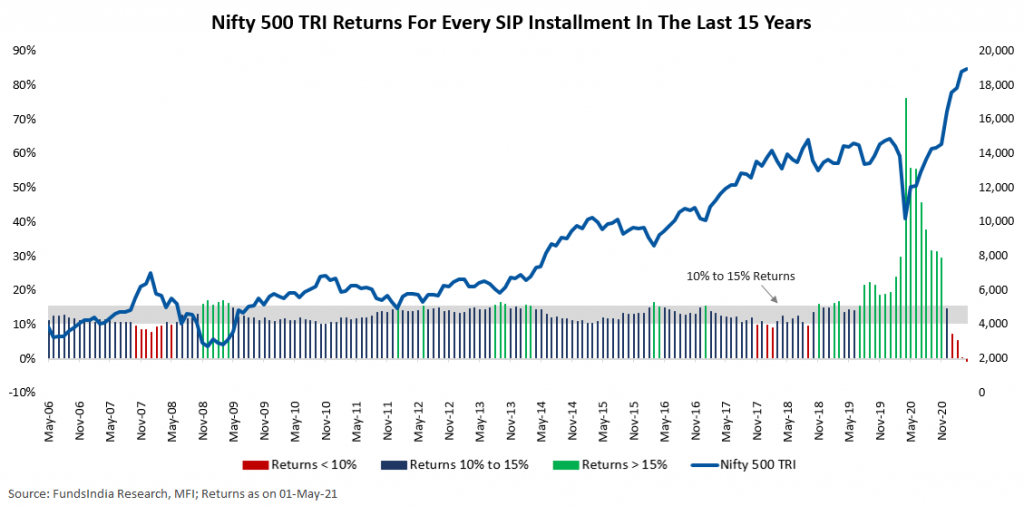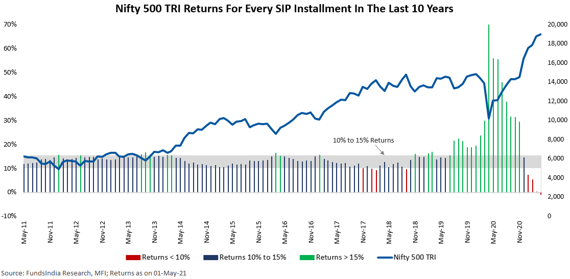 Let us take the example of a 10Y SIP in Nifty 500 TRI (the index which represents the largest 500 companies in Indian Stock Markets)
