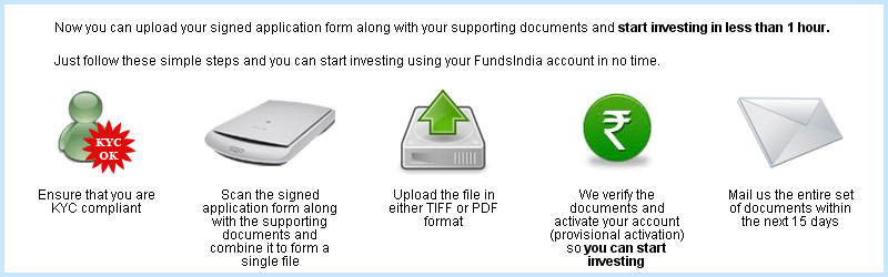 1. If you are already KYC registered (please see short note about KYC registration below), you can scan these documents (application form, terms and conditions document, PAN card copy, and cancelled cheque leaf) and upload it in your account (using the 'Document upload' link on the 'Downloads' page). Our staff will verify the documents thus uploaded and activate your account if everything is in order. You will receive an email about this 'Provisional activation' and you can start investing right away.However, please note that you will subsequently (within 15 days) need to send us the originals of uploaded documents.